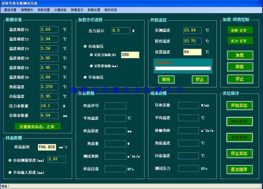 儀器特點(diǎn):帶自動(dòng)加壓(配用減速電機(jī)、高精度壓力傳感器、調(diào)速器),自動(dòng)測(cè)厚裝置(配用高精度位移傳感器測(cè)量),并連計(jì)算機(jī)實(shí)現(xiàn)全自動(dòng)控制。儀器采用6點(diǎn)溫度梯度檢測(cè),提高了測(cè)試精度。可檢測(cè)不同壓力下熱阻曲線,采用優(yōu)化的數(shù)學(xué)模型,可測(cè)量材料導(dǎo)熱系數(shù)和熱阻以及界面處接觸熱阻等多個(gè)參數(shù)。